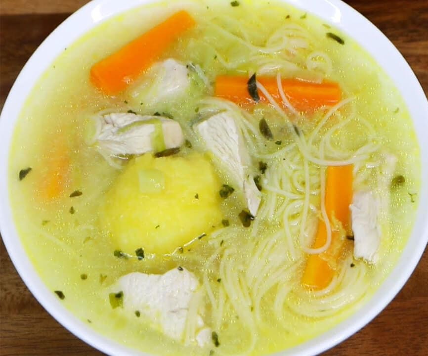 Trozos de Pechuga, papa amarilla, cabello de ángel y verdura rayada